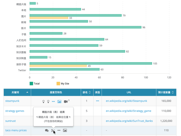 您的目标关键字会显示哪些类型的搜索页特色?用它作内容优化的指南。视频结果主导关键词搜索页?你可以制作视频内容。精选摘要排名高于您的网站?你可以为搜索者的问题写一个更好的答案来占据最高位置。